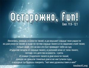 Содержание: Одним из наиболее популярных явлений для современного общества и особенно его молодой части стал fun. В переводе с англейского Fun означает веселье, беспечность, бесшабашность. Стремление получать fun прочно заняло ведущее место в системе ценностей людей в наше время. В этой проповеди мы рассмотрим это явление с точки зрения Священного Писания. Что такое веселье? Какое место оно должно занимать в жизни людей? Когда веселье становится опасным? На эти, и другие вопросы мы ответим, изучая одну из книг мудрости Ветхого Завета, книгу Екклесиаст.