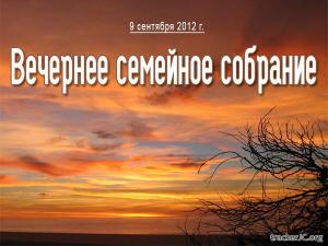 Описание: Очередное семейное собрание было посвящено подведению итогов лета и началу учебного года. Пастор Алексей Коломийцев проповедовал на тему: "Цель и основание эффективного образования" (Пр. 2:1-15). В заключении была совершена молитва о всех детях и молодежи, учащихся в различных учебных заведениях (школах, колледжах и университетах).
