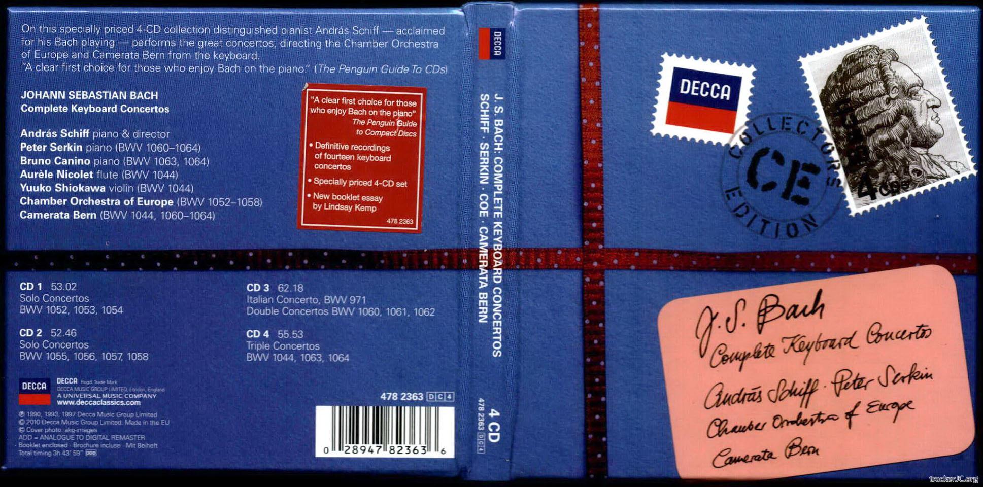 Четырёхдисковое издание включает все, или почти все концерты Баха для одного, двух и трёх клавиров с оркестром в фортепианном исполнении, итальянский концерт для сольного клавира (без оркестра), "тройной" ля-минорный концерт для флейты, скрипки, клавира, струнных и непрерывного баса.