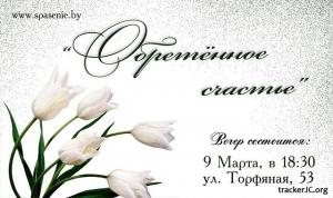 Описание: Когда наступит весна? Часто мы можем слышать подобный вопрос из уст нетерпеливого соседа, или друга, или просто проходящего мимо человека, а вот в сердцах милых девушек и женщин, посетивших 9 марта 2010 года церковь «Спасение», города Барановичи, я уверена, весна по-настоящему дала о себе знать. А всё дело в том, что именно тогда и проходил вечер, посвящённый чудесному весеннему празднику под названием «Обретённое счастье».